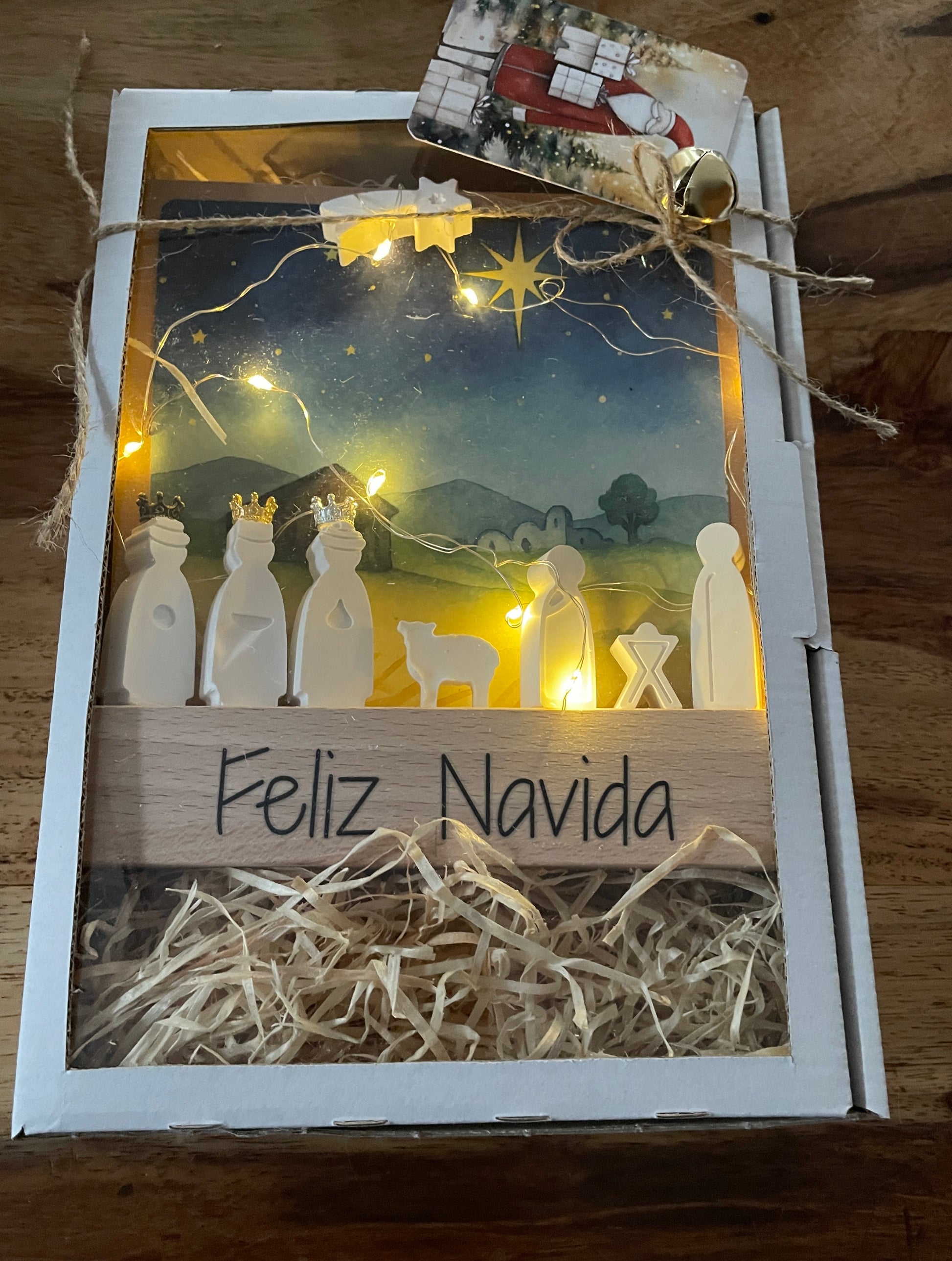 Jede Mini-Krippe wird mit einer integrierten Lichterkette geliefert und liebevoll verpackt – bereit zum Verschenken oder selbst Behalten.